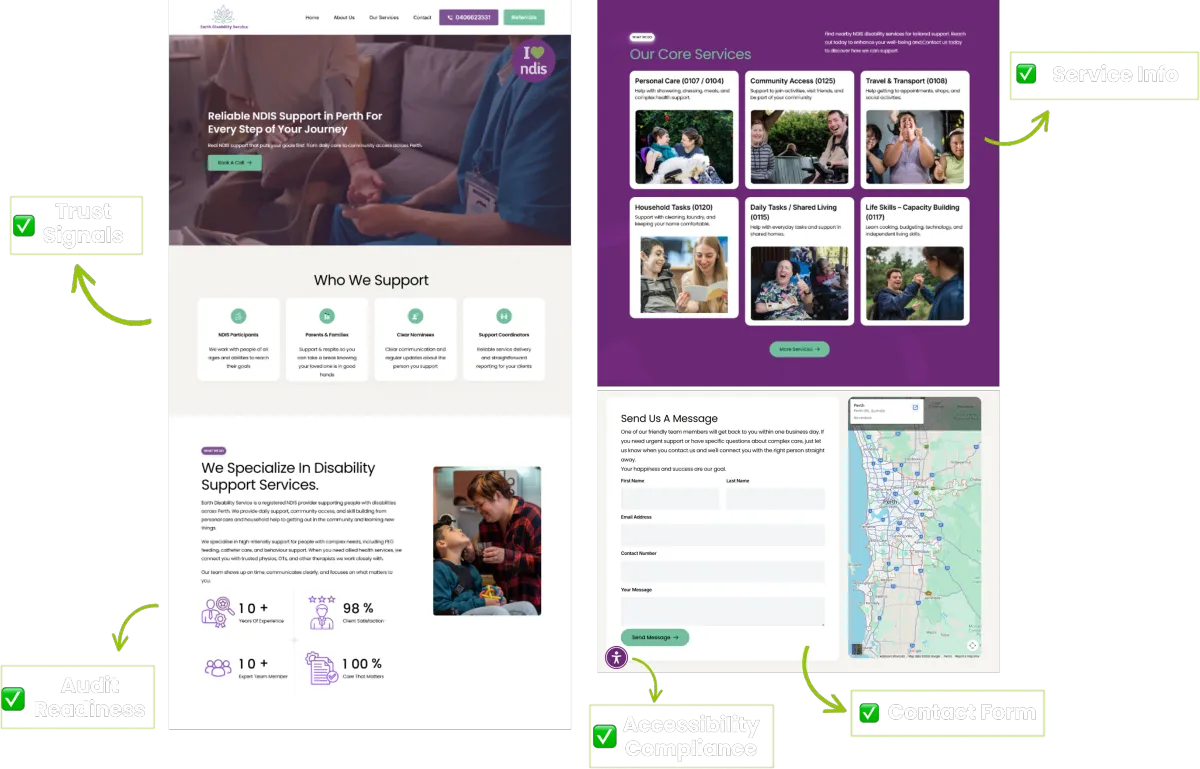 Clear service pages, NDIS registration display, a complaints and feedback pathway, privacy policy, service agreement pages, and a dedicated referral system for support coordinators. Mobile-friendly, accessible, audit-ready