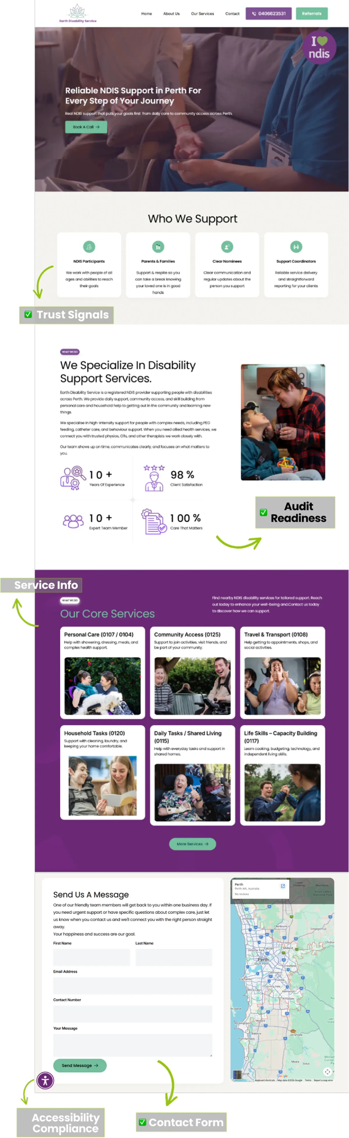 Earth Disability is a registered NDIS provider in Perth delivering core and community supports. They needed a website that coordinators could trust and auditors could approve.